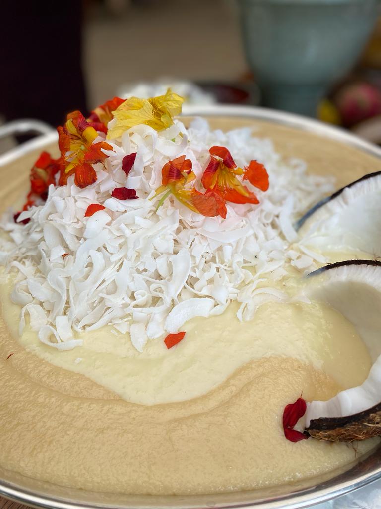 Moqueca de banana-da-terra: Banana-da-terra, pimentões, tomate e leite de coco ao dendê, servida com pirão de mandioca.